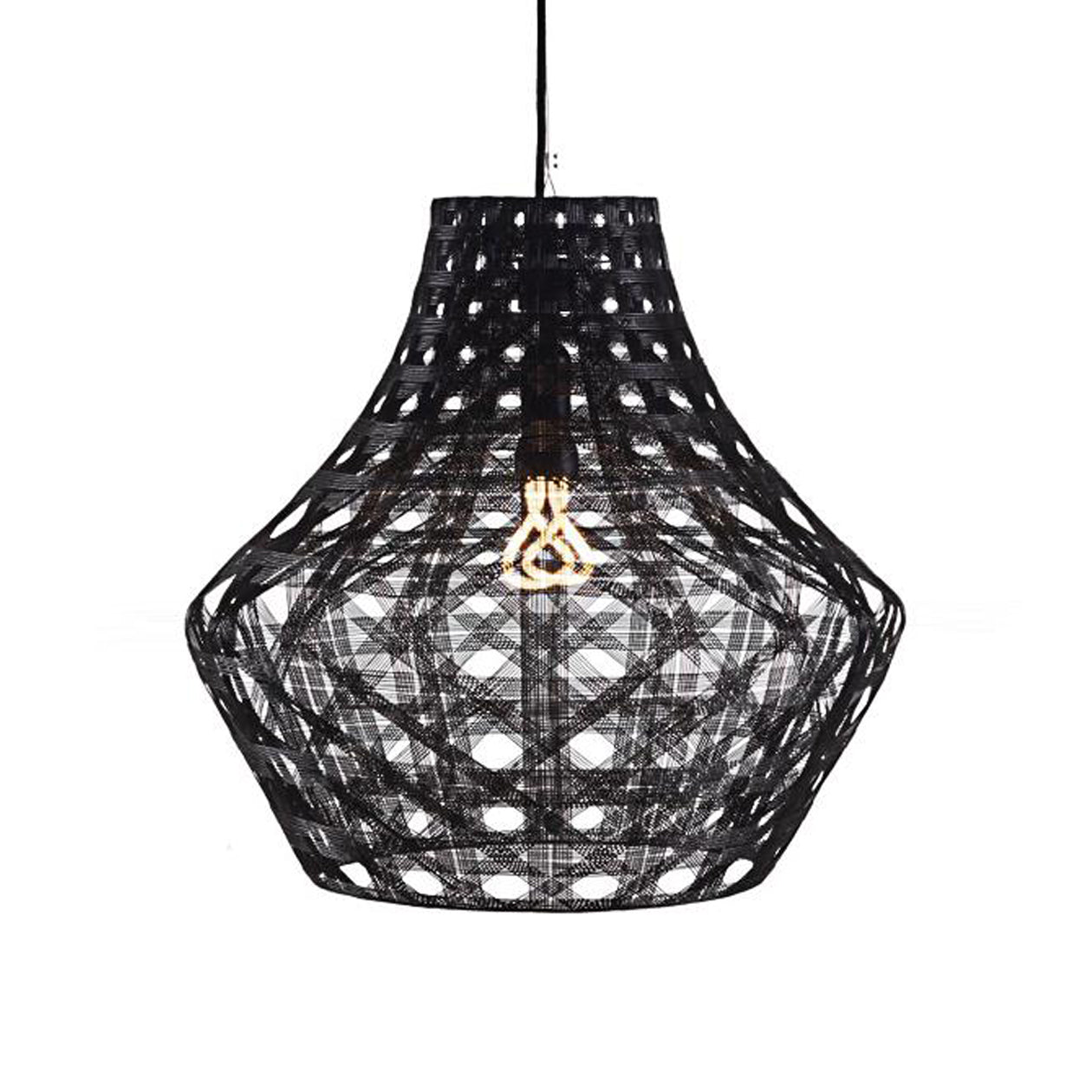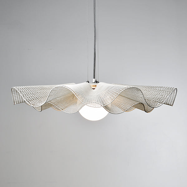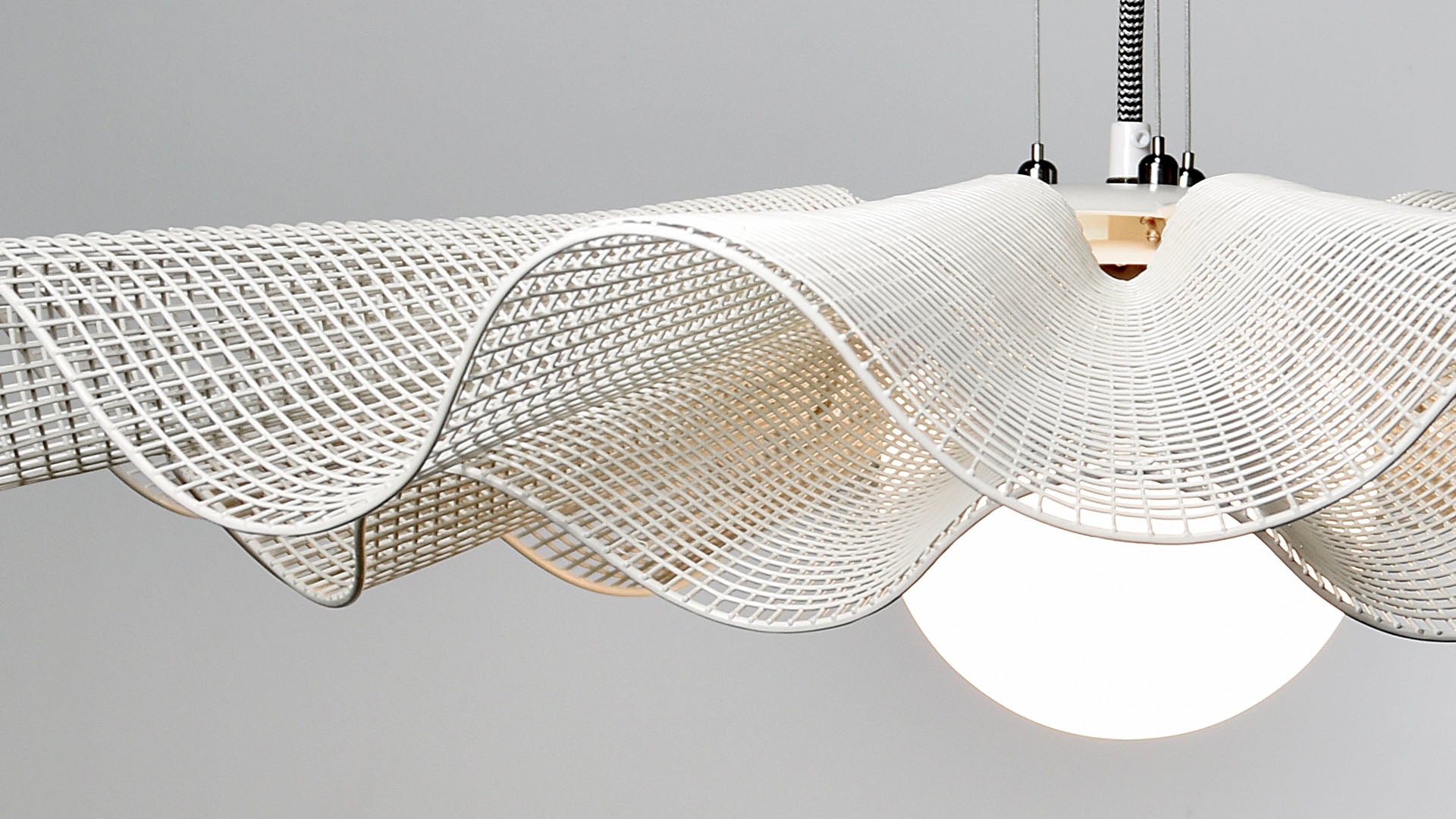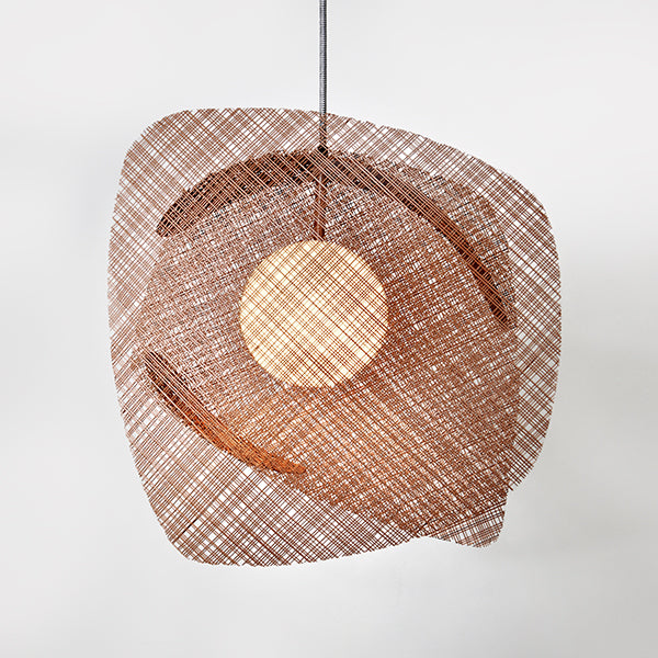 This handwoven metal light fixture creates a playful interplay of light and shadow.