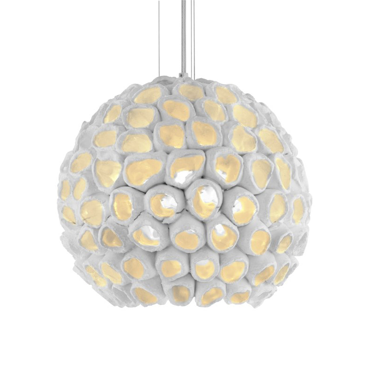 Glossy white ceramic feels modern and new. The hint of coral formations on a reef forms a band of detail along the bottom. Big, bold and gutsy, this fixture dominates a space while providing excellent light. Designed by Lorenzo Zanovello and made by Italian artisans in the Veneto.